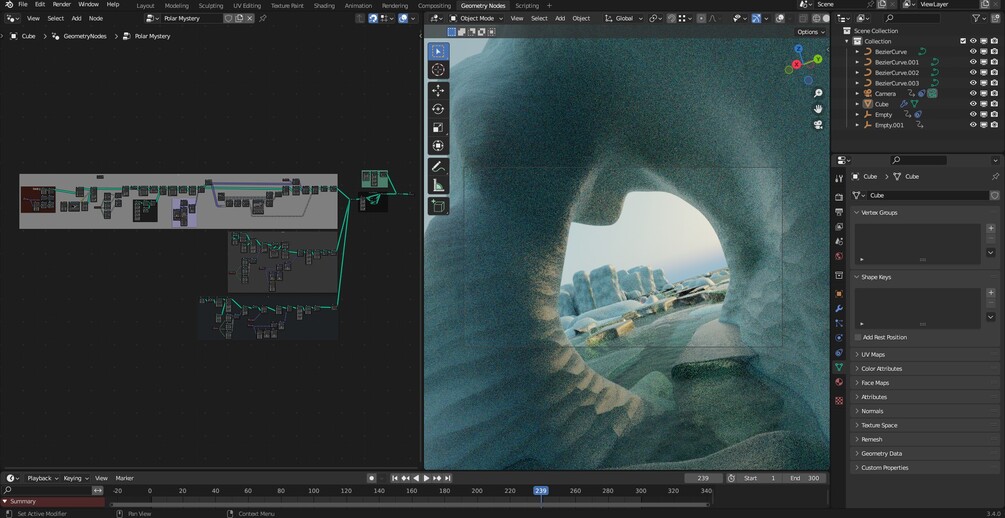 This is the complete and cleaned up blender project I made for the 2022 Nodevember prompt #8 called Polar Mystery. Including all animation data for the camera but the most interesting aspect should be learning how to generate the iceberg, ice cave and floating ice and the procedural materials. Use at least blender 3.4 to open the project or some shader nodes just fail!